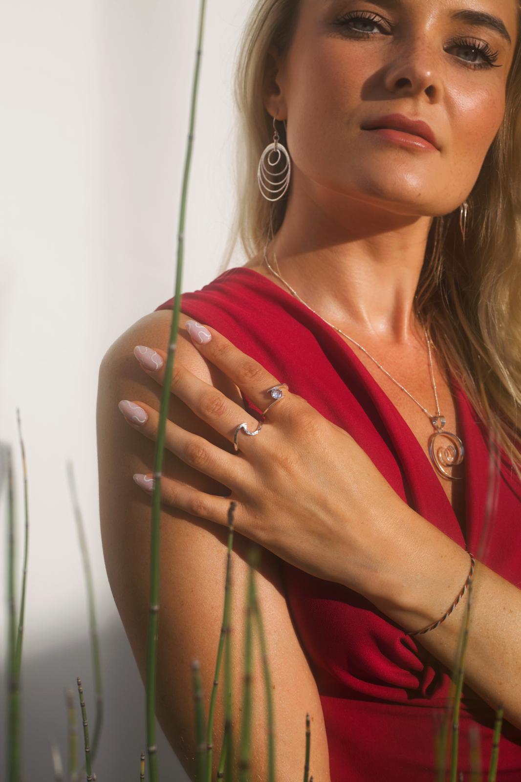 A minimalist ring with a wavy shape symbolizing freedom and movement. Made of silver, it catches the eye with its subtle shine.