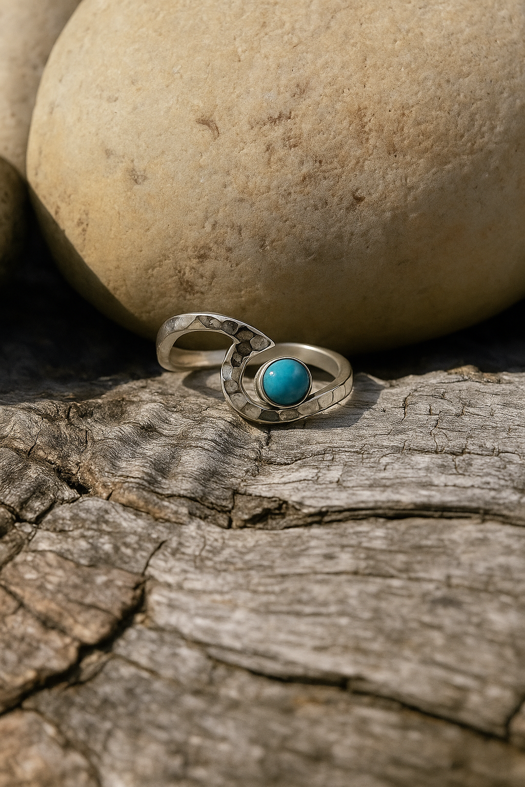 A silver ring of medium thickness with a hammered texture and a central turquoise stone.