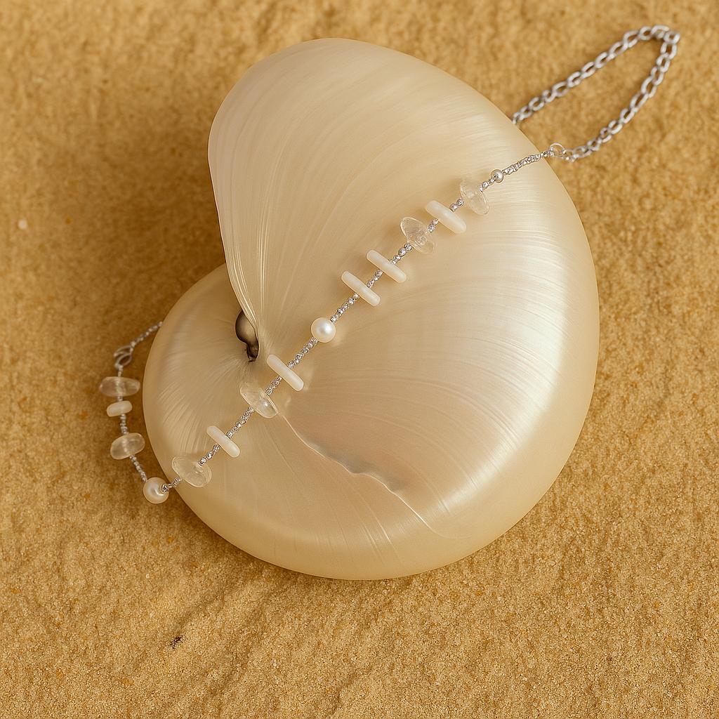 Inspired by the beauty of the ocean’s edge, the Silver & Pearl Coastal Drift Necklace features a serene combination of freshwater pearls and shell-inspired chips delicately strung along a sleek silver-toned chain. The soft, organic shapes evoke the rhythm of gentle waves and sun-bleached shores.