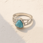 Pierścionek z naturalnym kamieniem larimar o błękitnym odcieniu przypominającym Karaiby. Osadzony w gładkiej, srebrnej oprawie.