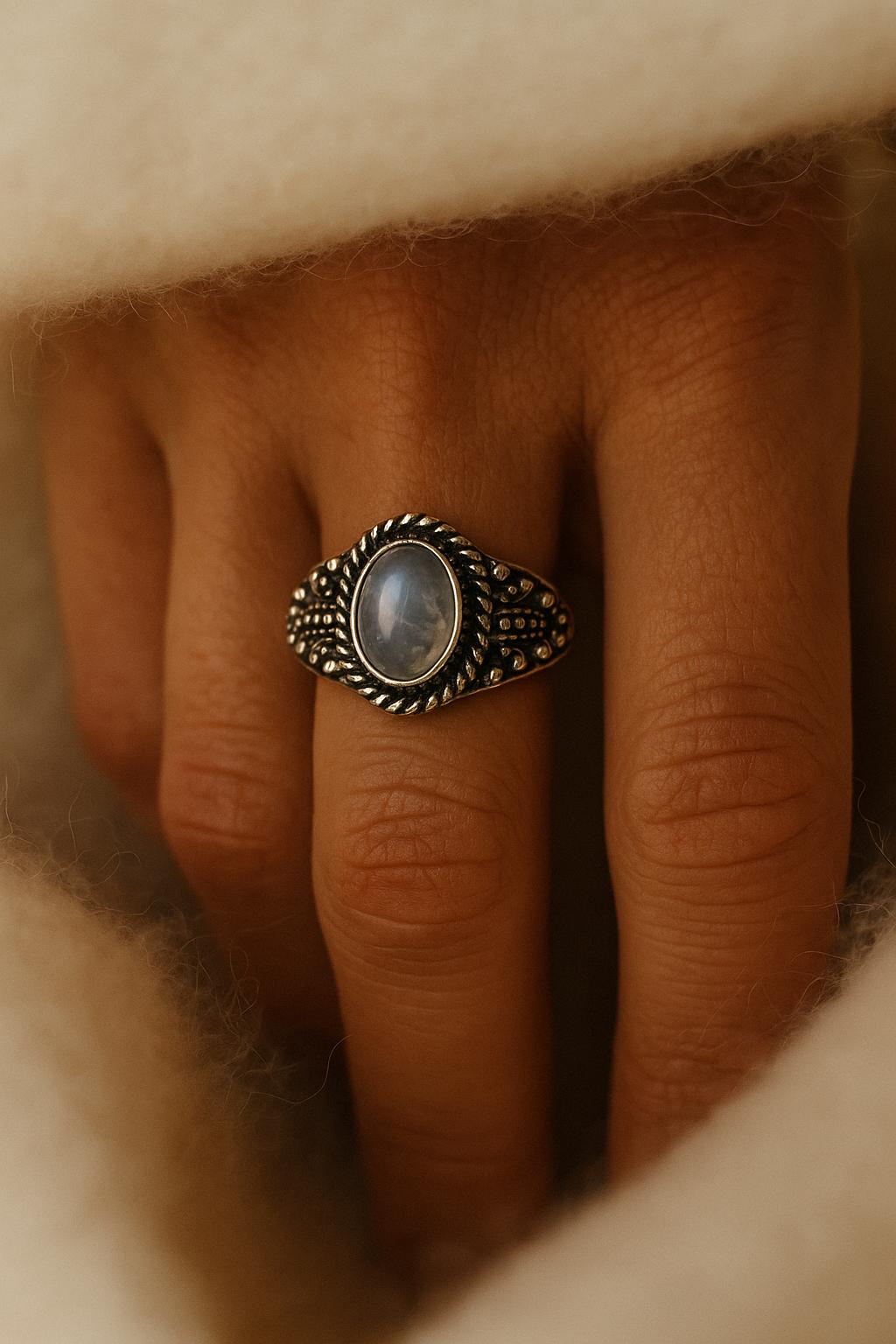 Pierścionek z naturalnym kamieniem księżycowym, który pięknie mieni się w świetle. Magiczny i subtelny — łączy elegancję z codziennym komfortem.