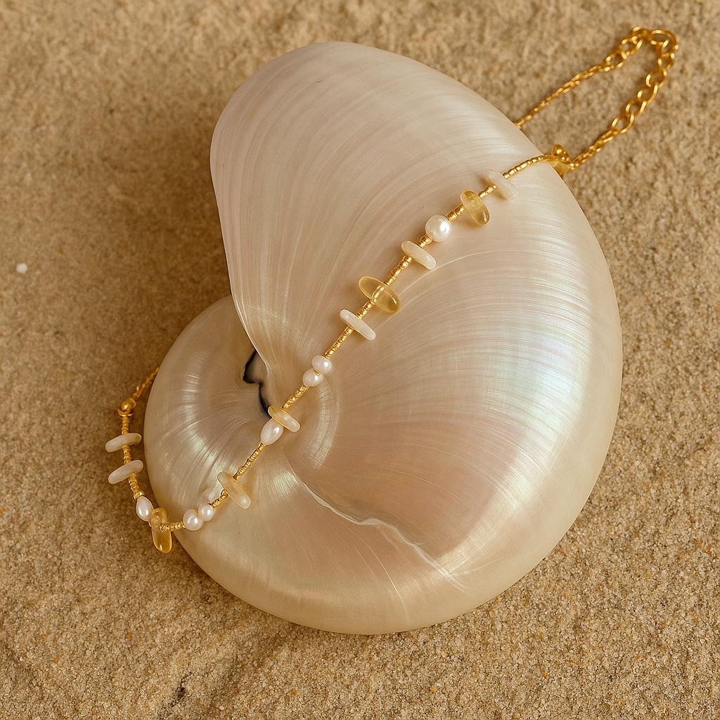 Pozłacany naszyjnik inspirowany muszlami z perełkami słodkowodnymi. Delikatny, morski styl o wyrafinowanej elegancji boho. Doskonały na wakacje i na co dzień.