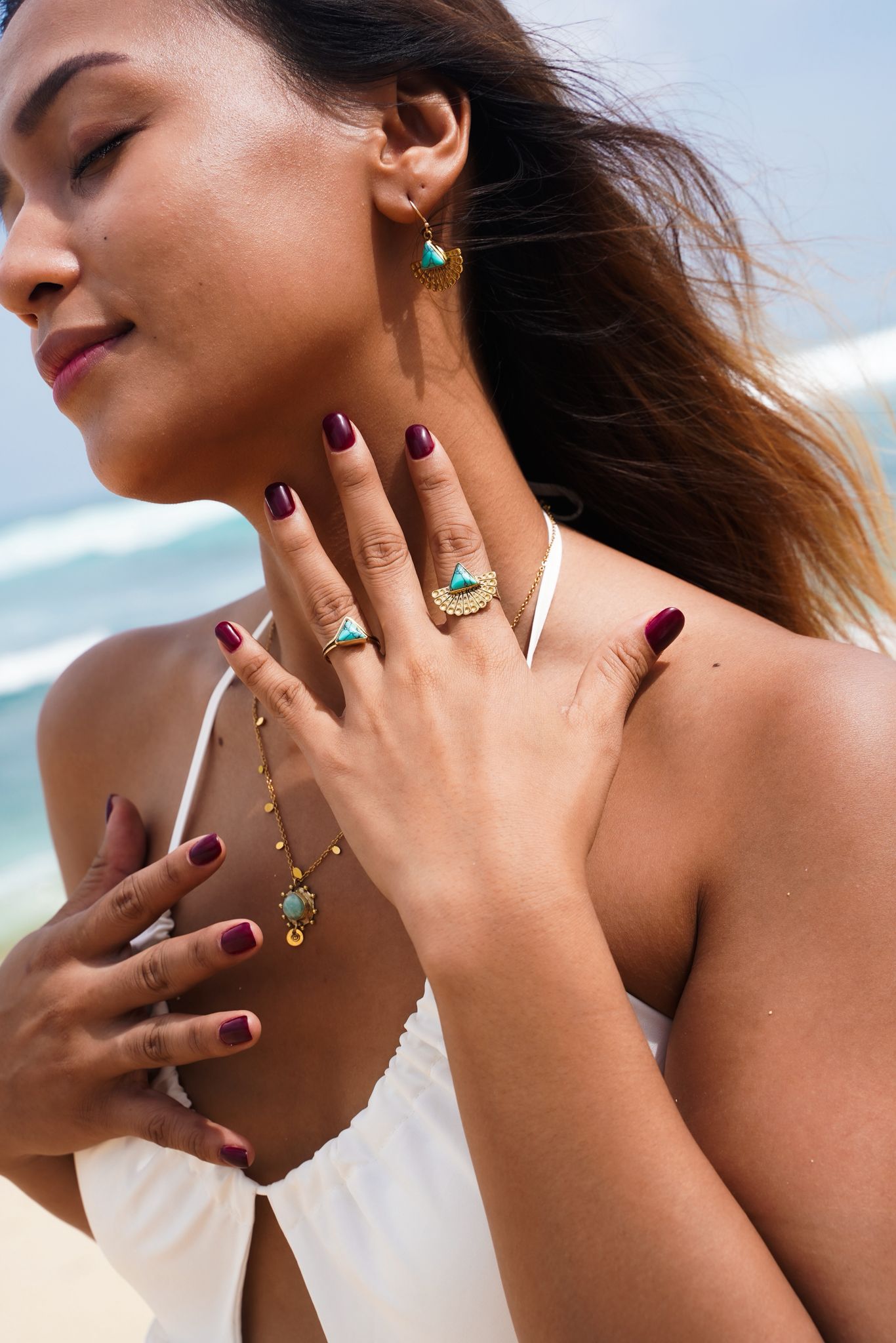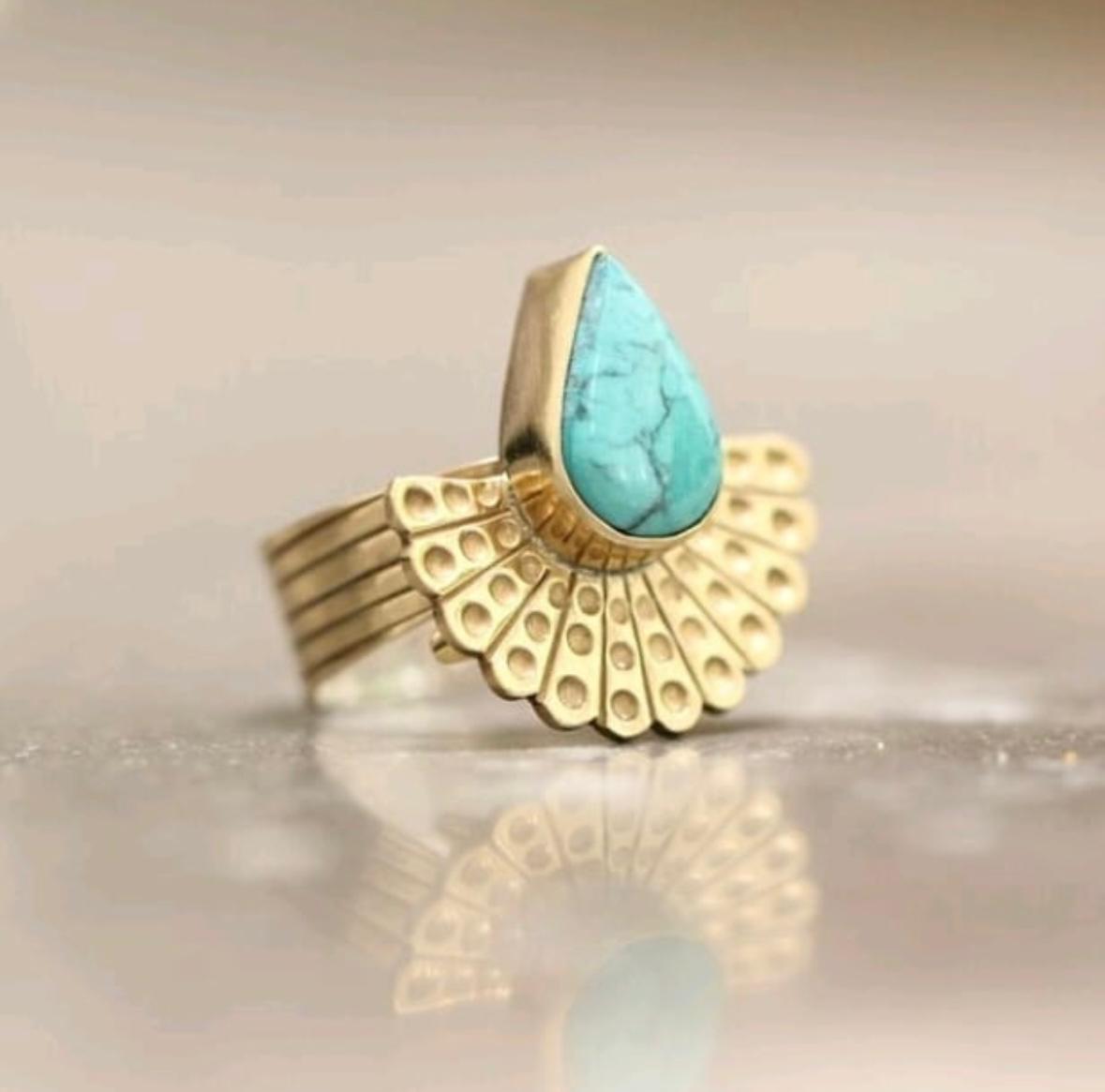 Pozłacany pierścionek z trójkątnym turkusem i wachlarzem złotych kropek. Zainspirowany plemienną elegancją i pięknem natury. Przyciąga uwagę i opowiada historię.