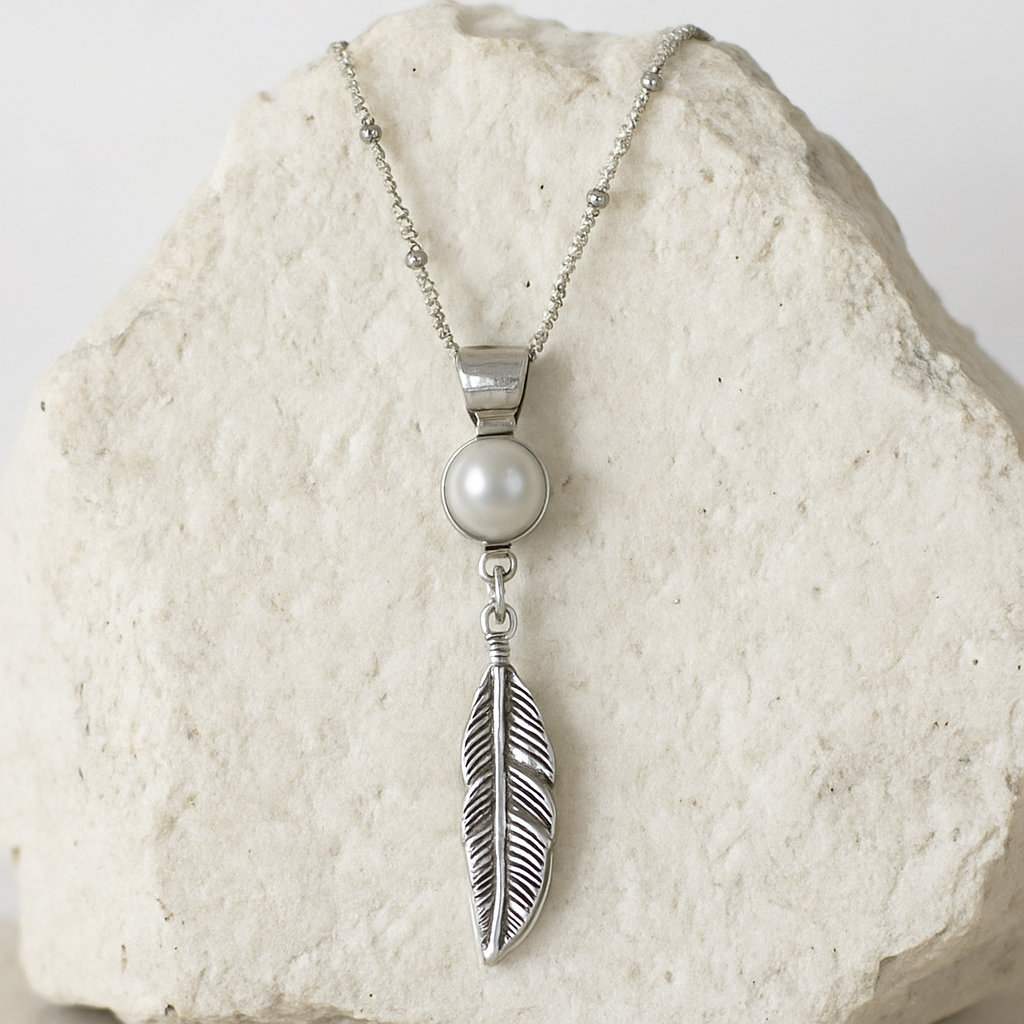 Symboliczny i subtelny naszyjnik ze srebra z perłą w połyskującej oprawie oraz zawieszką w kształcie pióra. Symbolizuje wolność, lekkość i duchową harmonię.